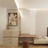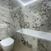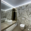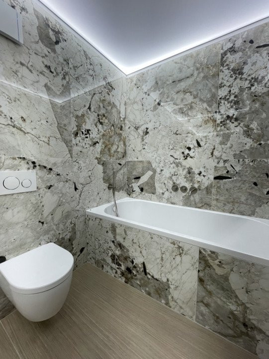 Baile sunt foarte elegante, cu finisaje premium – faianță cu aspect de marmură verde, lavoare pe blat (tip vas), oglinzi mari, cada și duș walk-in cu pardoseală din lemn. Iluminarea este modernă, cu barisol.