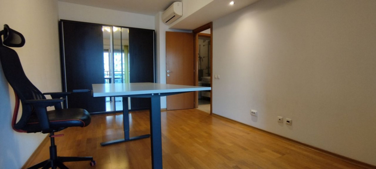 Apartament 3 camere decomandat situat la etajul 5 din 10, are un living spațios și luminos cu suprafata de 36 mp, bucataria este inchisa, total mobilata si utilatata, dotata cu electrocasnice incorporate, aragaz, frigider, cuptor cu microunde, cafetiera. Are doua dormitoare: unul cu terasa, doua bai: una cu cada si fereastra, a doua-cu cabina de dus. Holul este spatios, are un dressing cu multiple spatii de depozitare. Apartamentul are 3 aparate de aer conditionat: respectiv in fiecare camera si parchet triplu stratificat. Blocul are centrala proprie si 2 etaje subterane pentru parcare.
