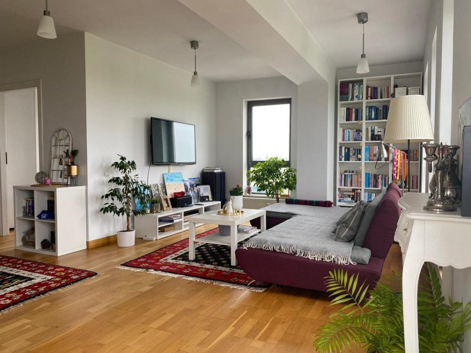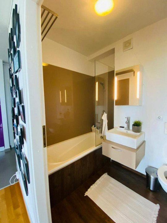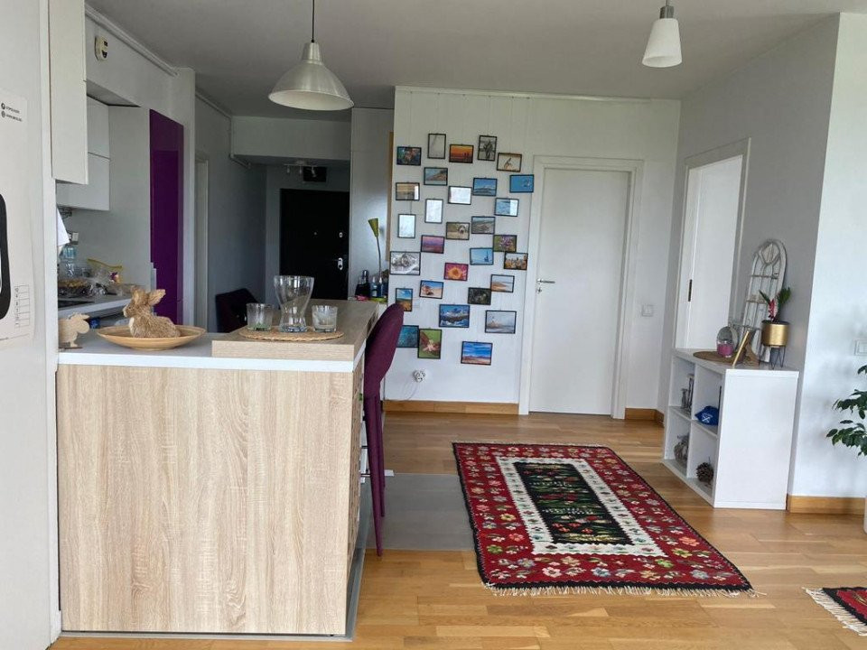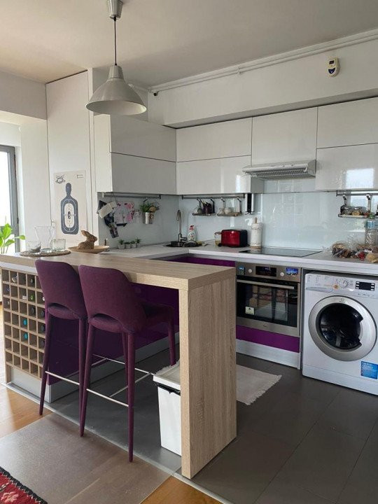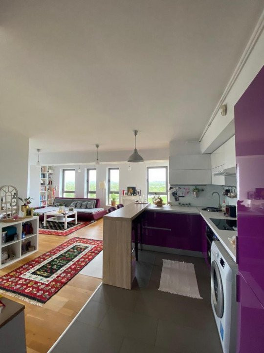 Complet mobilata si utilata, aceasta dispune de un living cu bucatarie openspace, de 35mp, cu suprafete vitrate mari, ce permit intrarea luminii, 2 dormitoare spatioase, dintre care unul cu baie proprie, si 2 bai (una prevazuta cu cada iar cealalta este o baie de serviciu) dar si multiple spatii de depozitare.