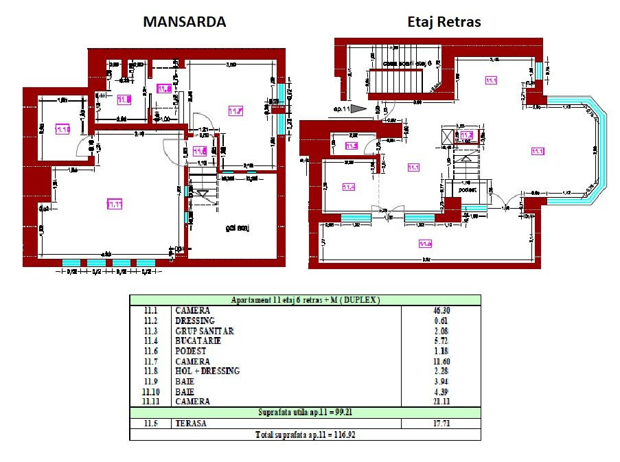 Dispune de o suprafata de 100 mp utili, si de o terasa suplimentara de 17 mp, este decomandat si compartimentat astfel: living, dinning, bucatarie, baie, spatiu de depozitare si terasa la primul etaj, iar in partea superioara a apartamentului dispunem de 2 dormitoare o baie si spatiu de depozitare.