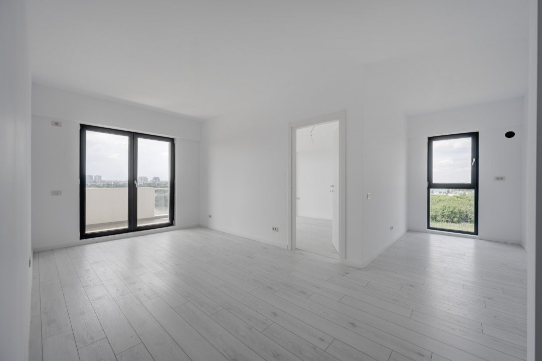 Interior luminos, bine compartimentat, cu ferestre panoramice de la podea la tavan, dormitor matrimonial, 2 bai si acces din toate camerele catre terasa de 16 mp cu vedere spre lac.
