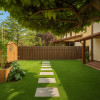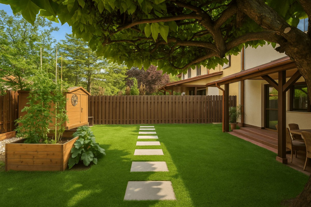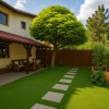 Curte intimă, amenajată, cu zonă de luat masa și spațiu liber, inconjurat de verdeata