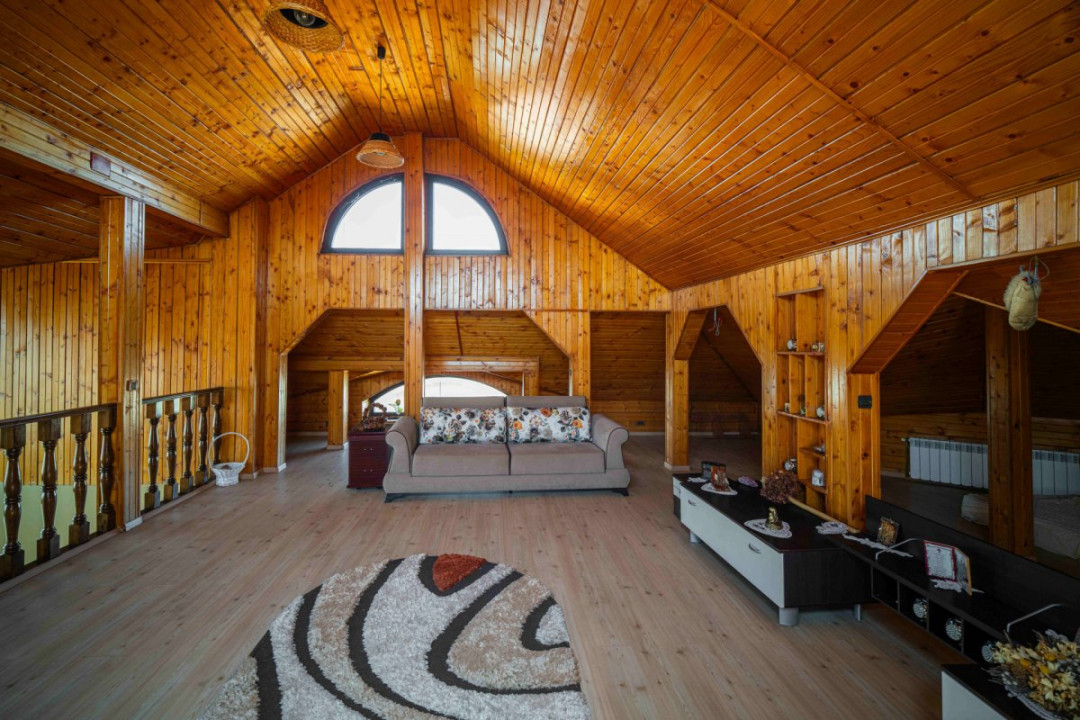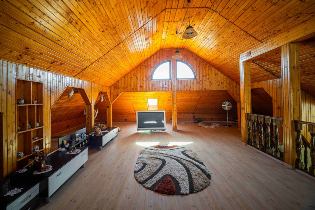 Mansarda, de 102 mp utili, este complet amenajată, construită din lemn de cireș, oferind un spațiu elegant, cald și versatil, ideal pentru birou, hobby room, studio sau zonă de relaxare.
